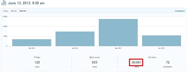 ↑左から、三月3,493、四月7,393、五月13,776、六月(13日現在)5,435のページビューです。
