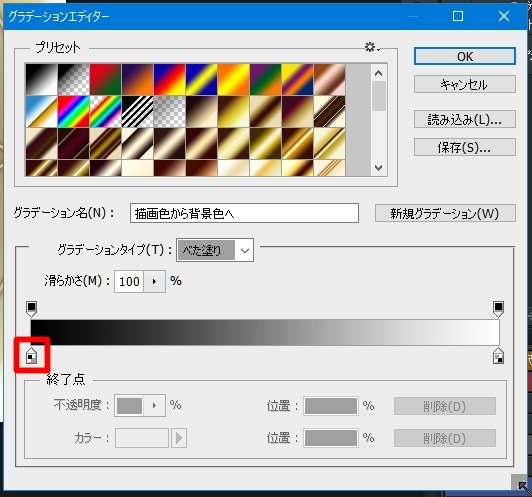 色の位置を整えて、グラデーション名をつけて、『新規グラデーション』ボタンをクリック。