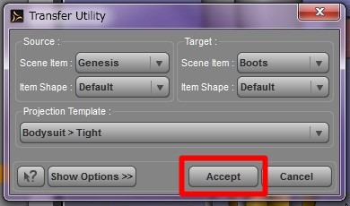ブーツを選択した状態で、トランスファーユーティリティーを設定。