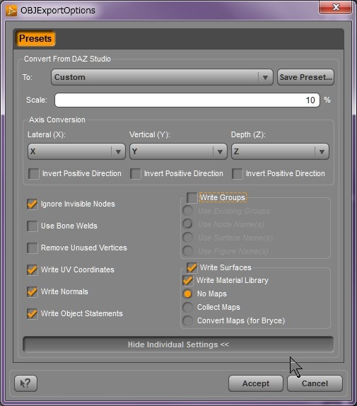 明らかに、服のボーンが邪魔っぽい気がしたのでOBJで書き出した。