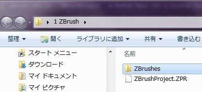 デスクトップ(E:\etc\Desktop\1 ZBrush)にフォルダを作成して、ブラシをフォルダごとコピーした。